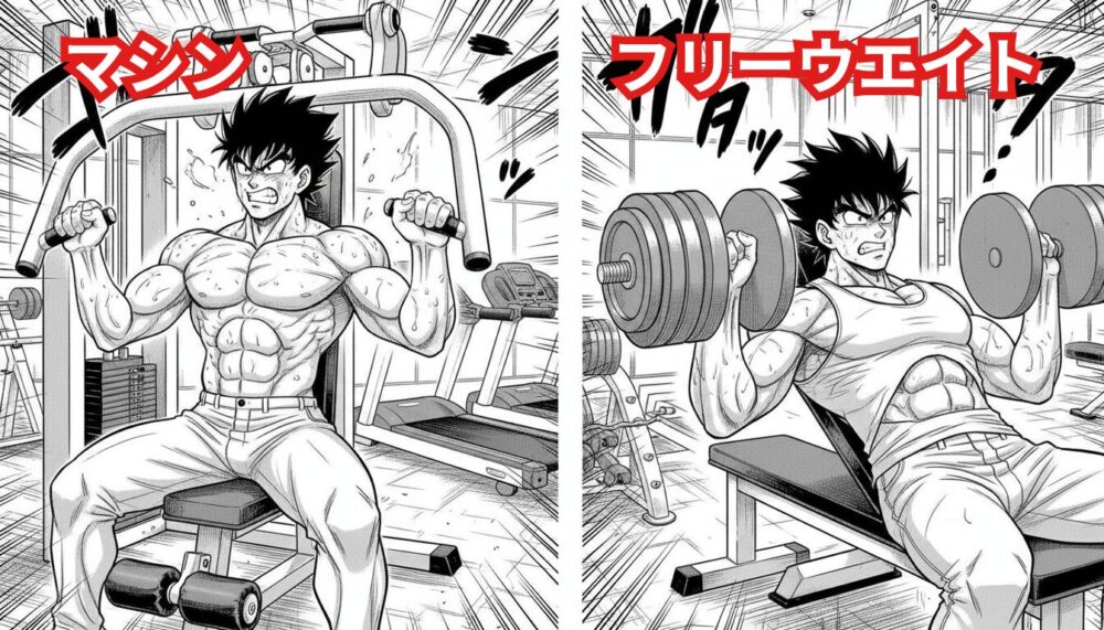 筋トレマシンで行う”マシントレーニング”に対し、ダンベルやバーベル・自体重を負荷にしておこなうのが”フリーウエイトトレーニング”。