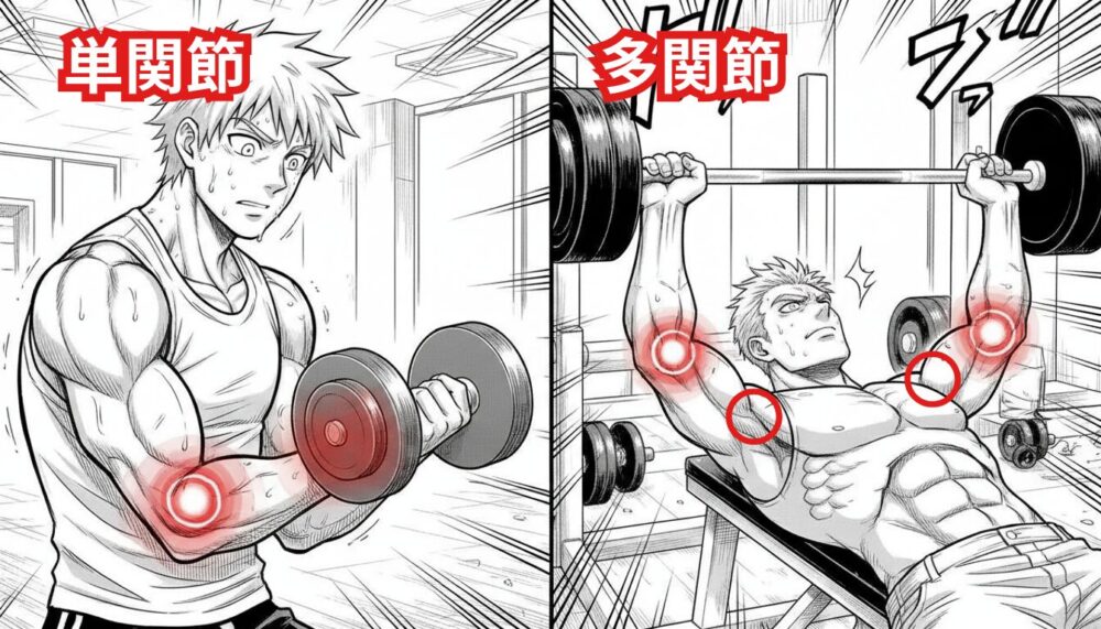 例えば”アームカール”は肘しか動かないので単関節種目。”ベンチプレス”は肩・肘と、複数の関節が動くので多関節種目です。
